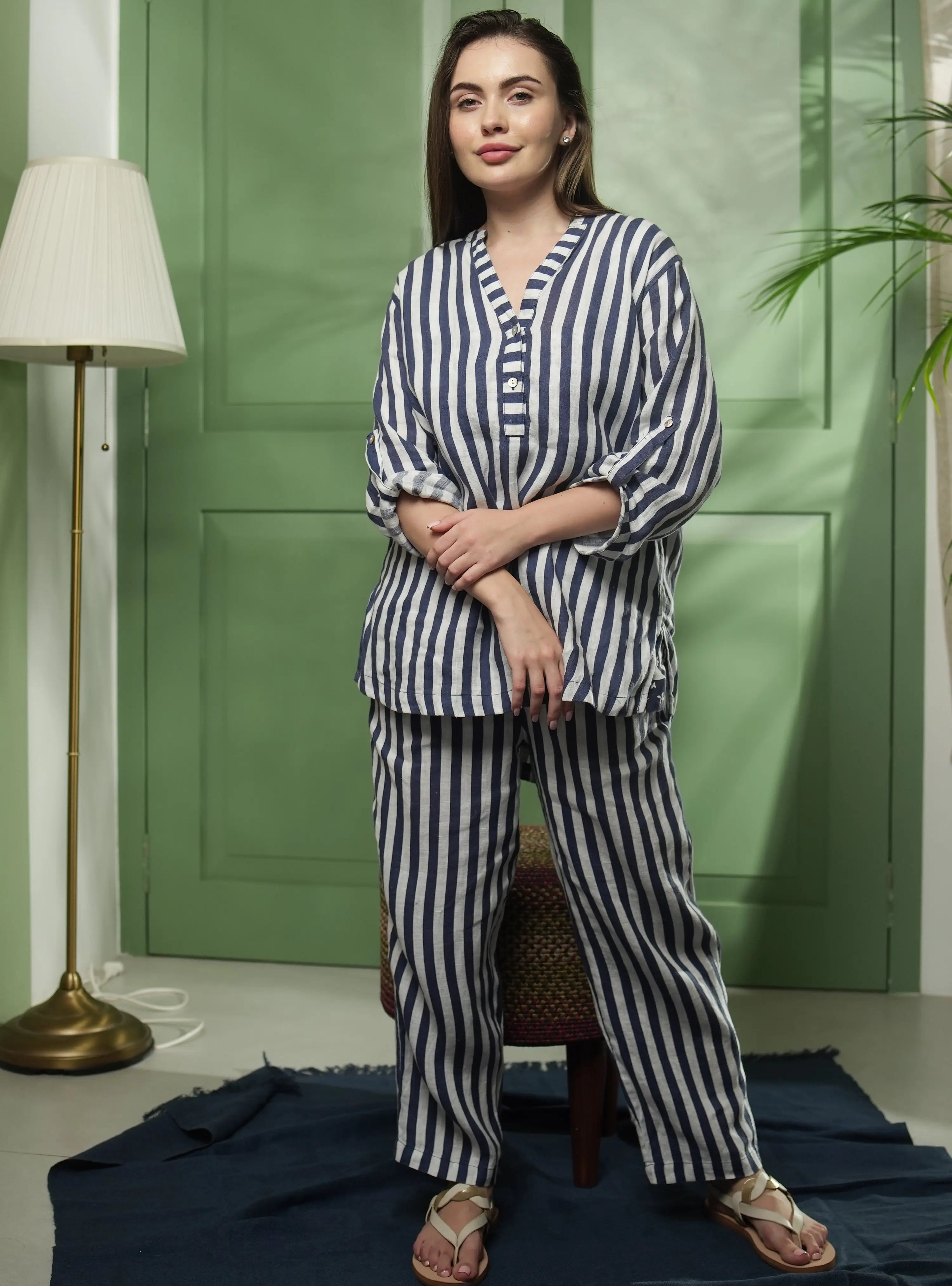 The Ella Pure Natural Linen Blue Bliss Stripe Printed Co-Ord Set features a stylish and comfortable combination of pure natural linen fabric with a unique blue bliss stripe print. The set includes a relaxed-fit top and matching pants, perfect for effortless chic. Ideal for casual outings or relaxing at home, this set combines elegance and comfort.