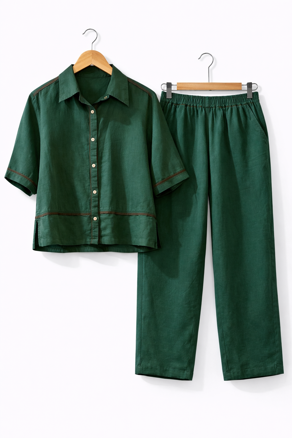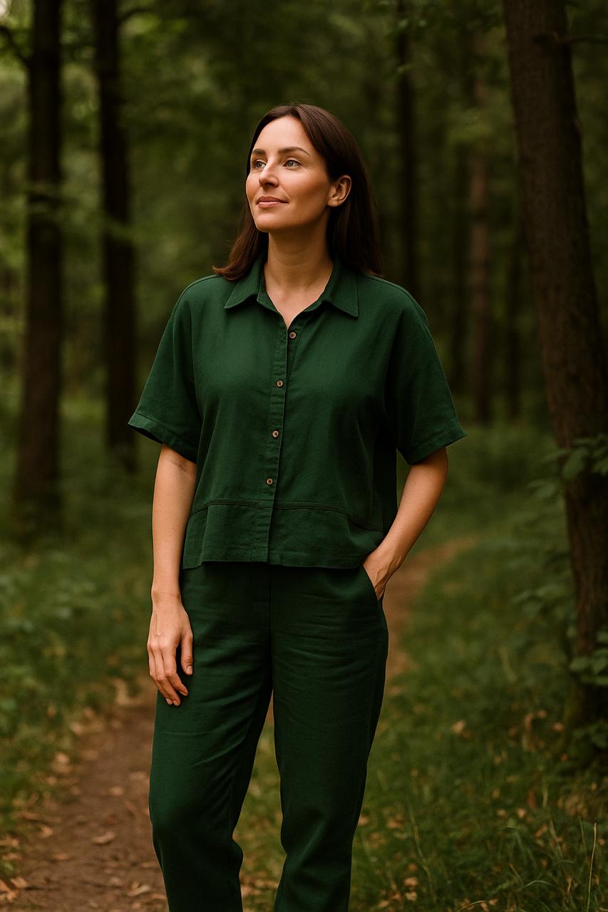 The matching trousers are designed with a comfortable elastic waistband and a straight, relaxed-leg fit, creating a streamlined yet effortless silhouette. The rich emerald tone adds depth and sophistication, making it ideal for resort holidays, brunch outings, travel wear, or chic everyday styling.
