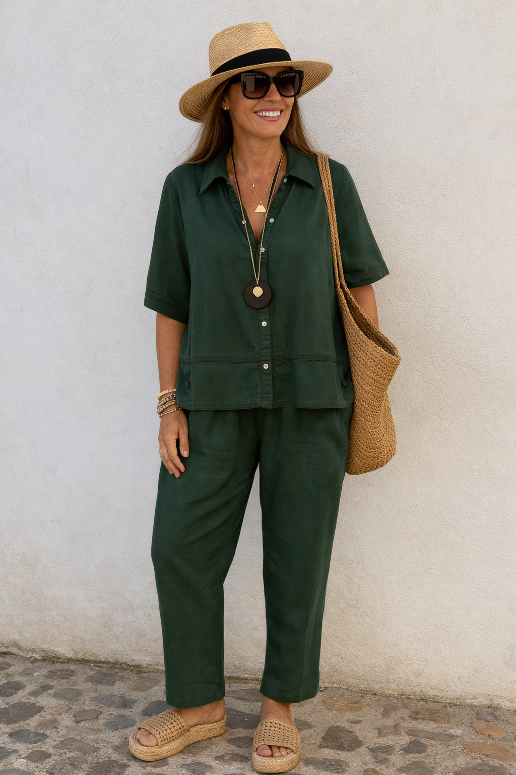 This linen-blend set pairs beautifully with woven accessories, statement jewelry, and sandals for a complete Mediterranean-inspired summer look.