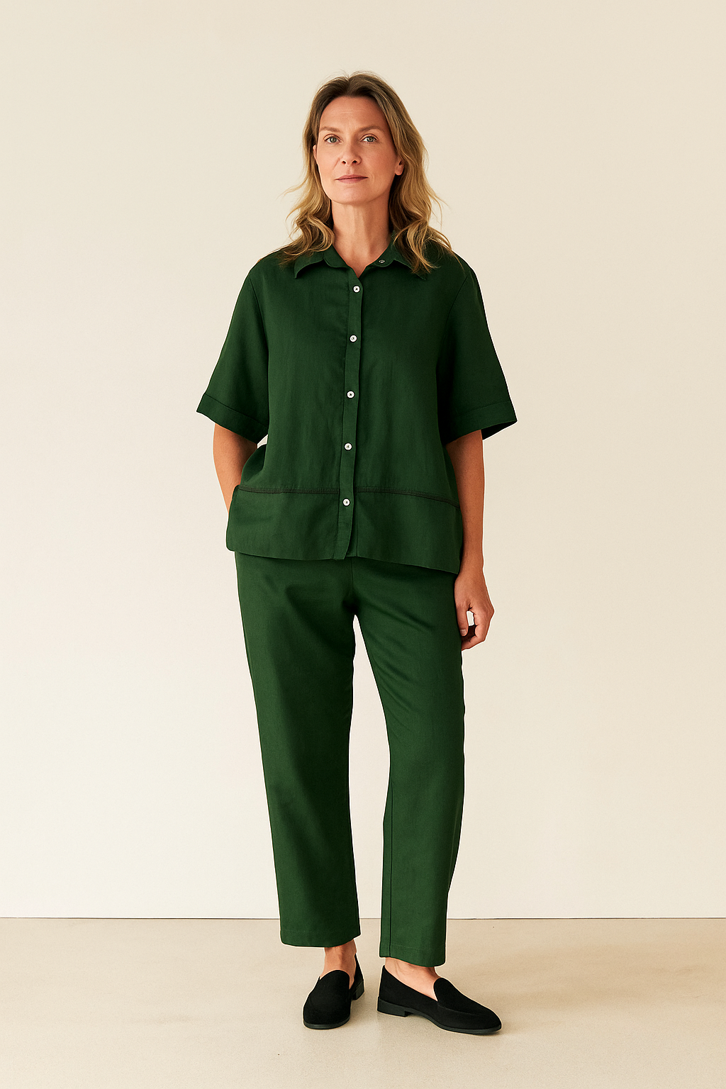 Effortlessly refined and timeless, this deep forest green linen-blend co-ord set is designed for elevated everyday dressing and modern resort wear. Crafted in a breathable, lightweight linen-blend fabric, the set offers a soft natural texture with a relaxed drape — perfect for warm-weather comfort.