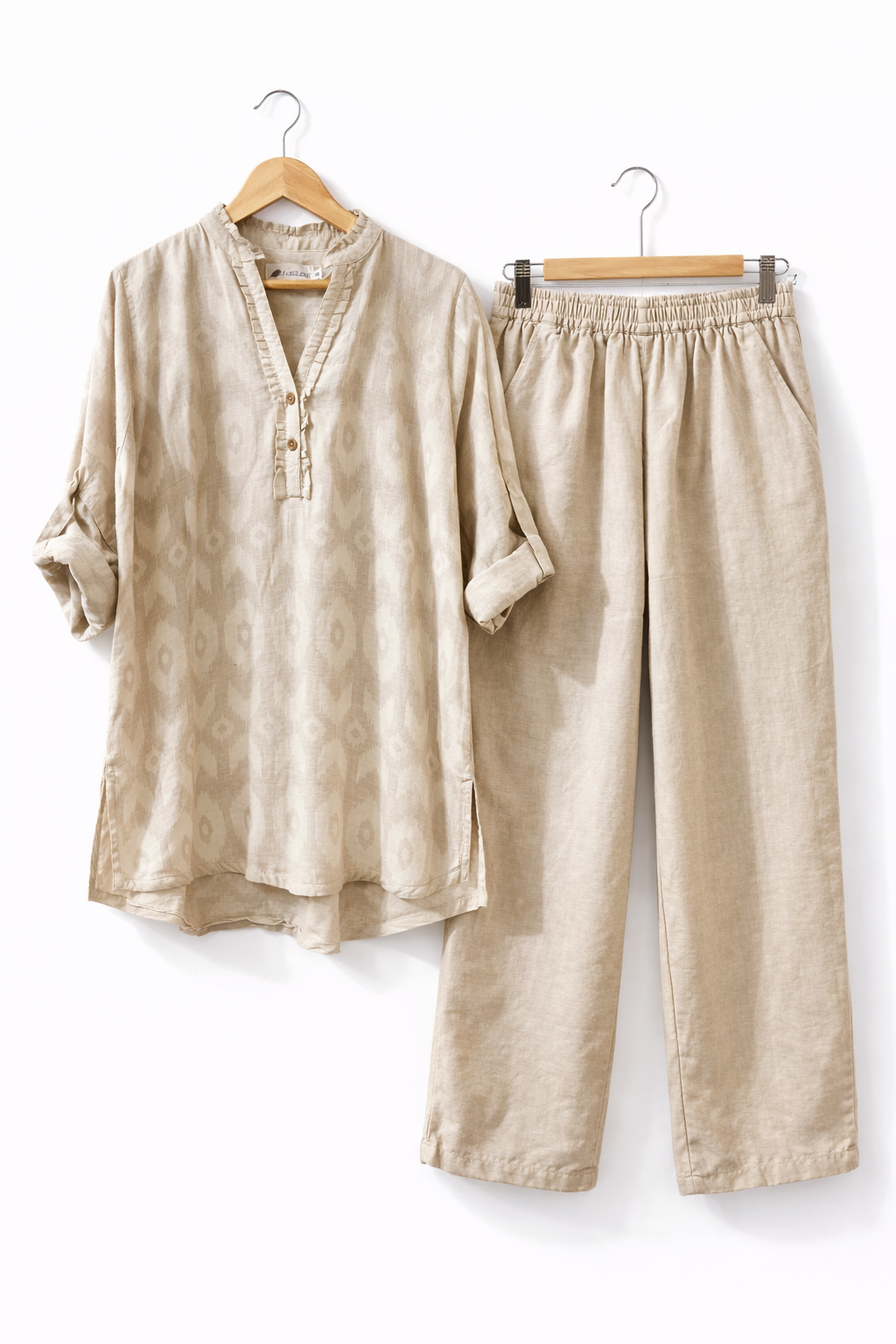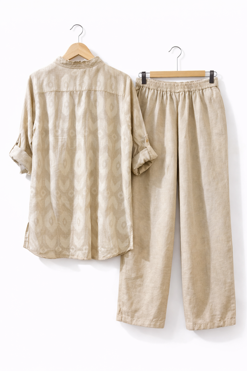 A subtle tone-on-tone ikat-inspired geometric print delicately woven into a soft beige linen-blend base. The muted pattern adds depth and texture without overpowering the garment, creating an understated, earthy elegance. The natural sand hue enhances the artisanal feel, making it perfect for minimal, Mediterranean, and resort-inspired wardrobes. The linen-blend fabric gives a breathable, lightweight structure with a soft drape and refined matte finish — ideal for warm climates and all-day comfort.