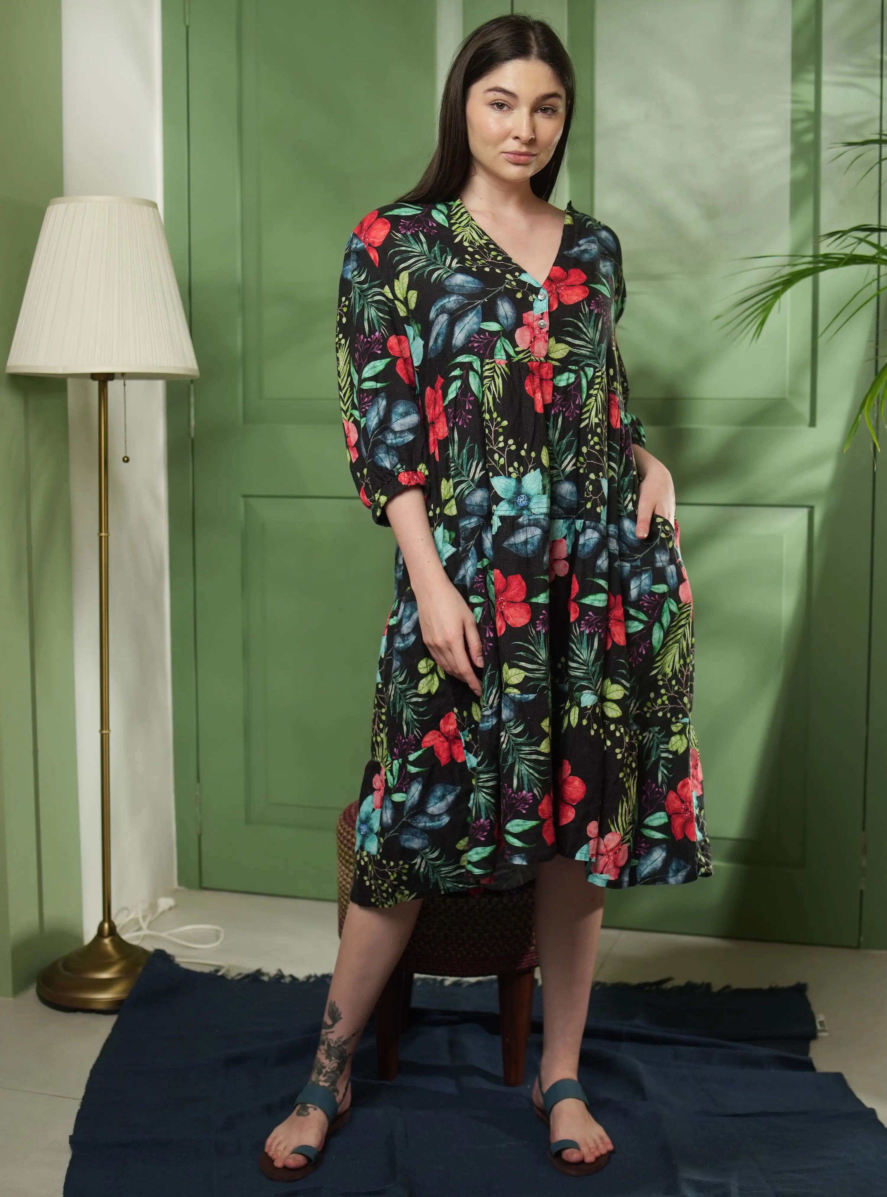 The DORA Pure Natural Linen Tropical Floral Oasis Dress is a vibrant and breezy garment designed for effortless elegance. Crafted from 100% pure natural linen, it features a stunning tropical floral print that evokes the beauty of a sun-kissed oasis. Perfect for warm weather, this dress offers both comfort and style, with its lightweight, breathable fabric and flattering silhouette. Ideal for both casual outings and relaxed vacations, it brings a touch of nature-inspired luxury to your wardrobe.