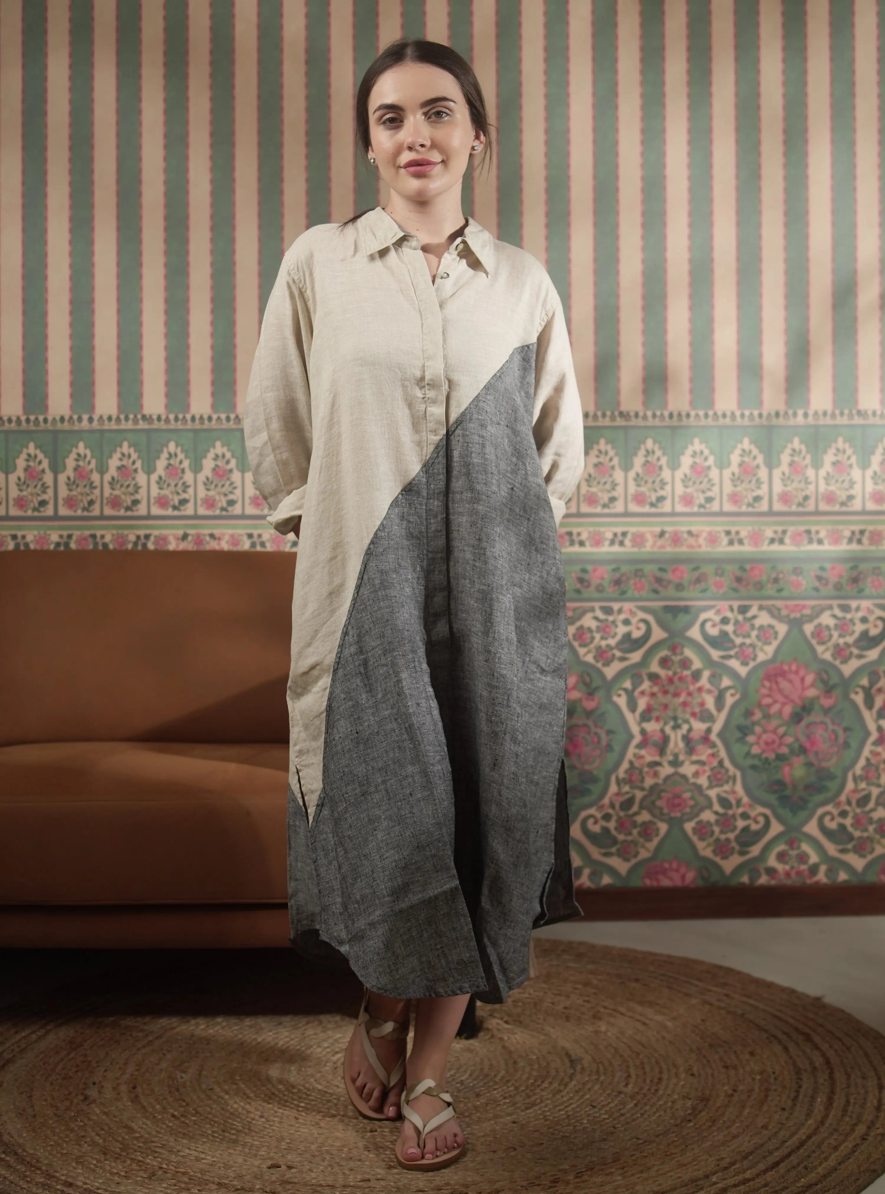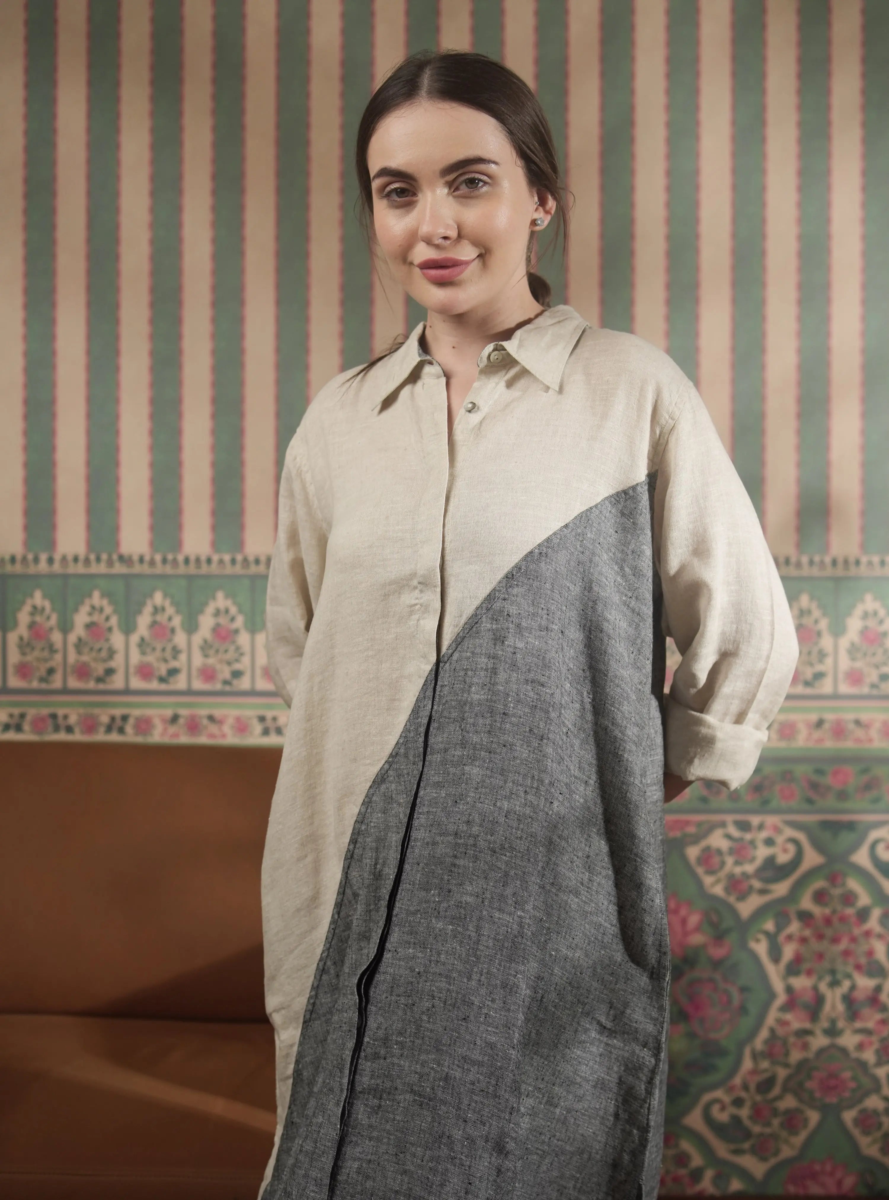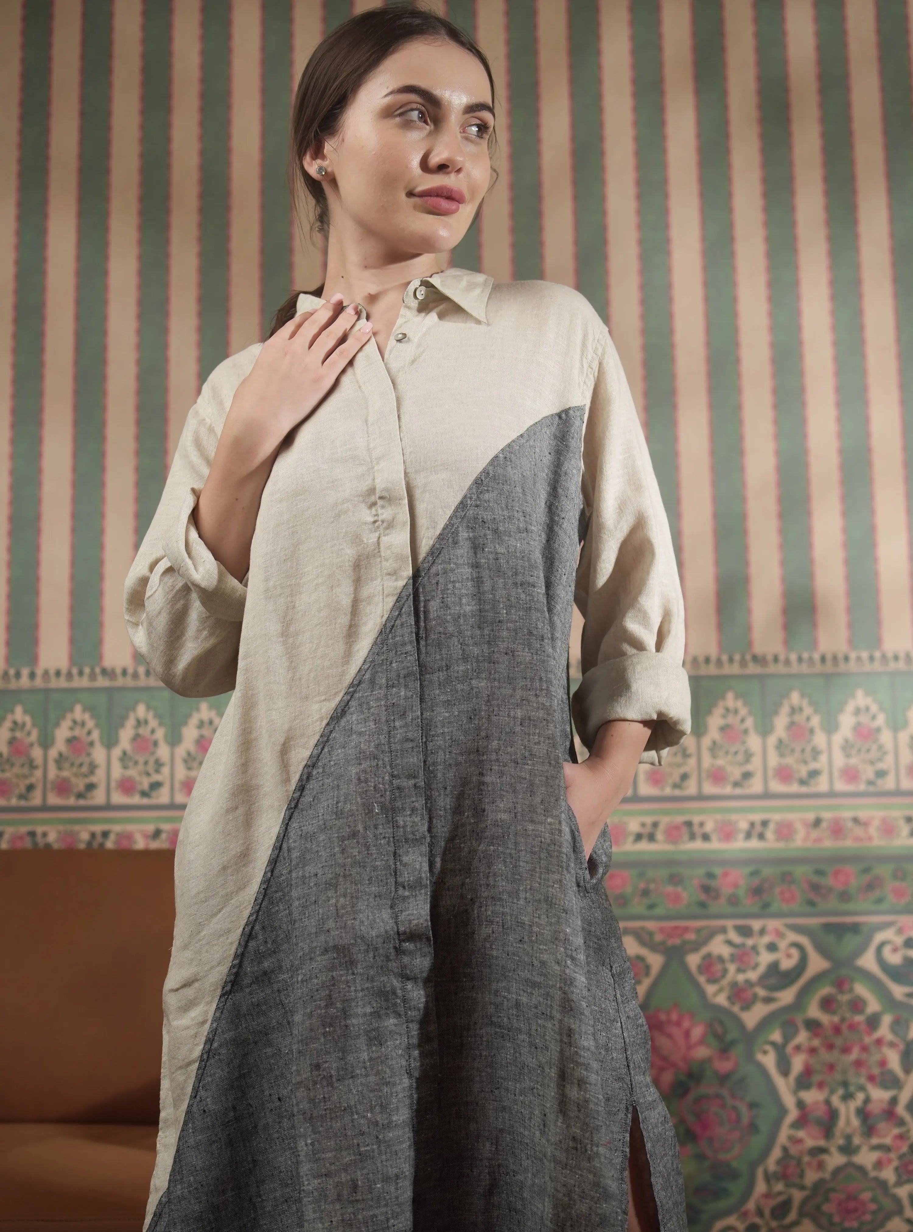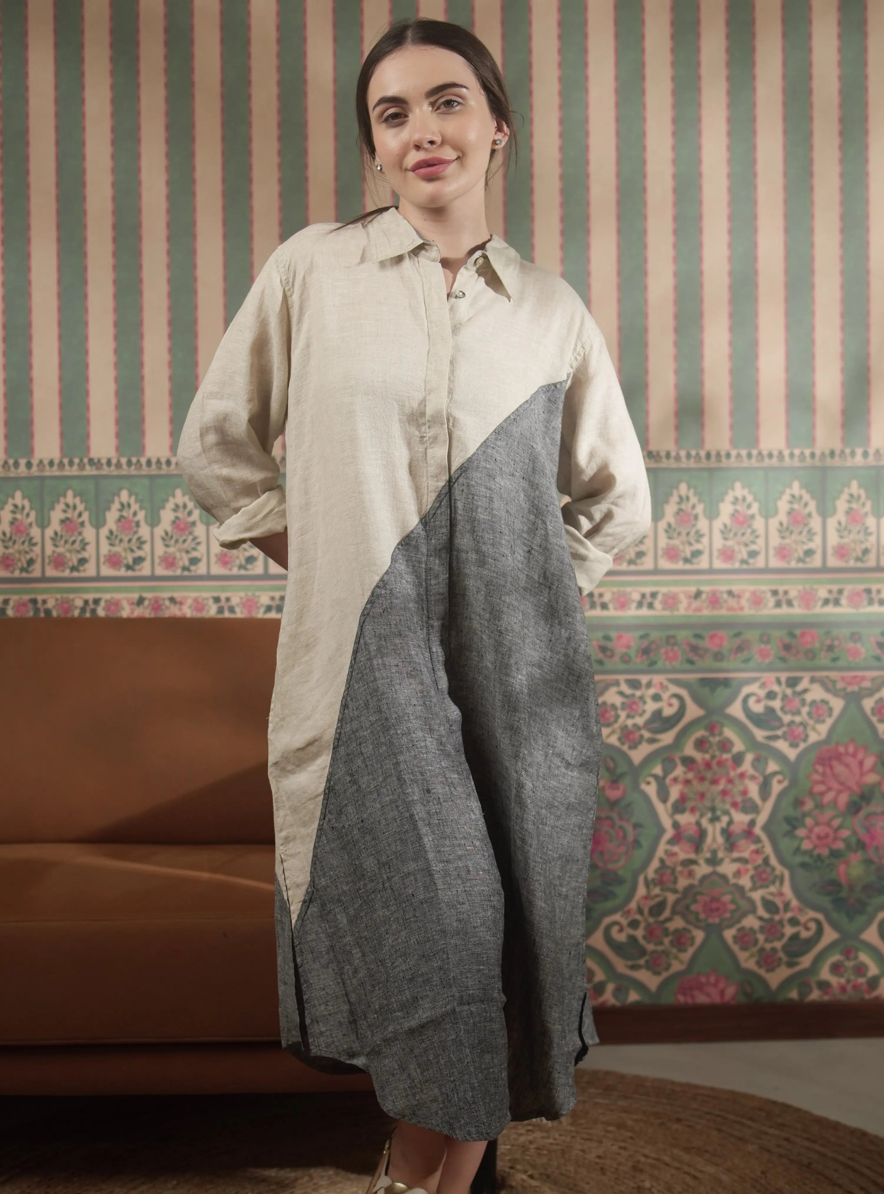 Shenna Shirt is a pure natural linen, color-block long dress, combining elegance with comfort. Perfect for casual or semi-formal occasions, it features a relaxed fit and a timeless design. A stylish choice for those who value quality and versatility.